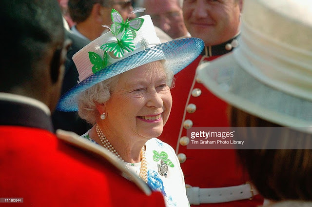 The look, minus the jacket, was repeated on 12 June 2006 at a Buckingham Palace garden party to mark to mark the 350th anniversary of the Grenadier Guards. The Queen predictably wore the Grenadier Guards badge: